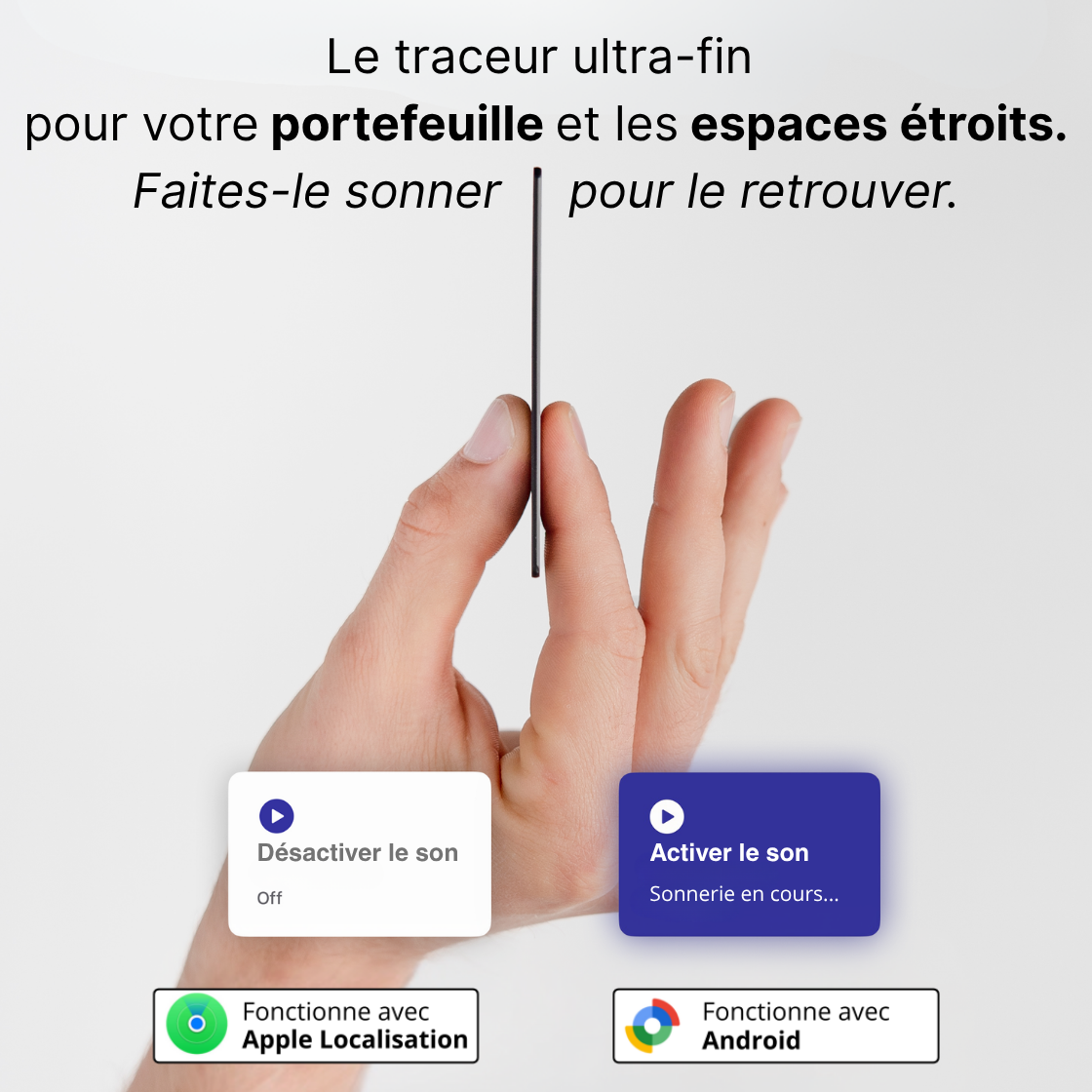 La carte de suivi Spotminders est ultra-fine, avec seulement 1,8 mm d'épaisseur. Elle se glisse facilement dans votre portefeuille sans encombrement ni gêne.