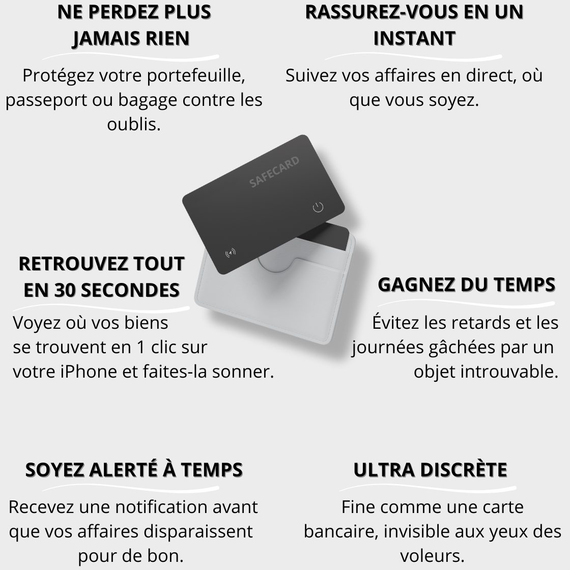 Notre carte est étanche, résistante aux rayures et conçue pour durer des années. En cas de souci, nous vous envoyons un remplacement ou vous remboursons. Profitez de 30 jours pour la tester sans risque ! Contactez-nous à safecardcontact@gmail.com